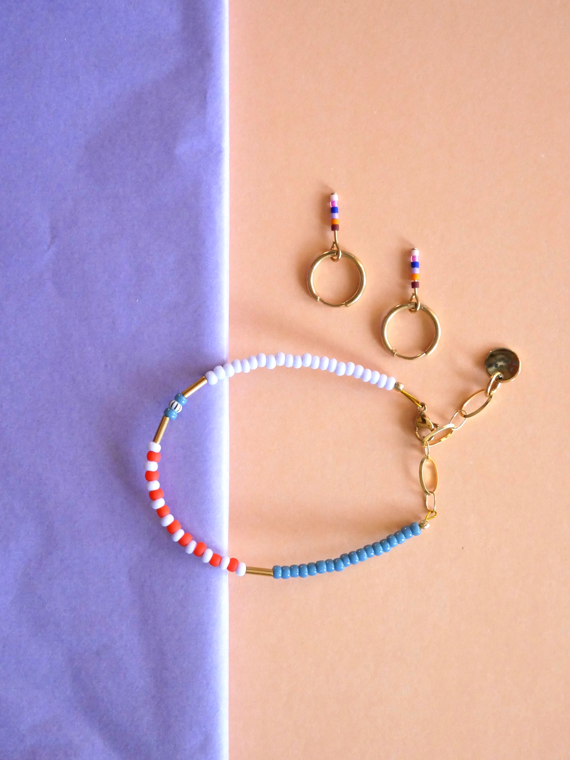 Armband jeansblau-rotorange-flieder #gold